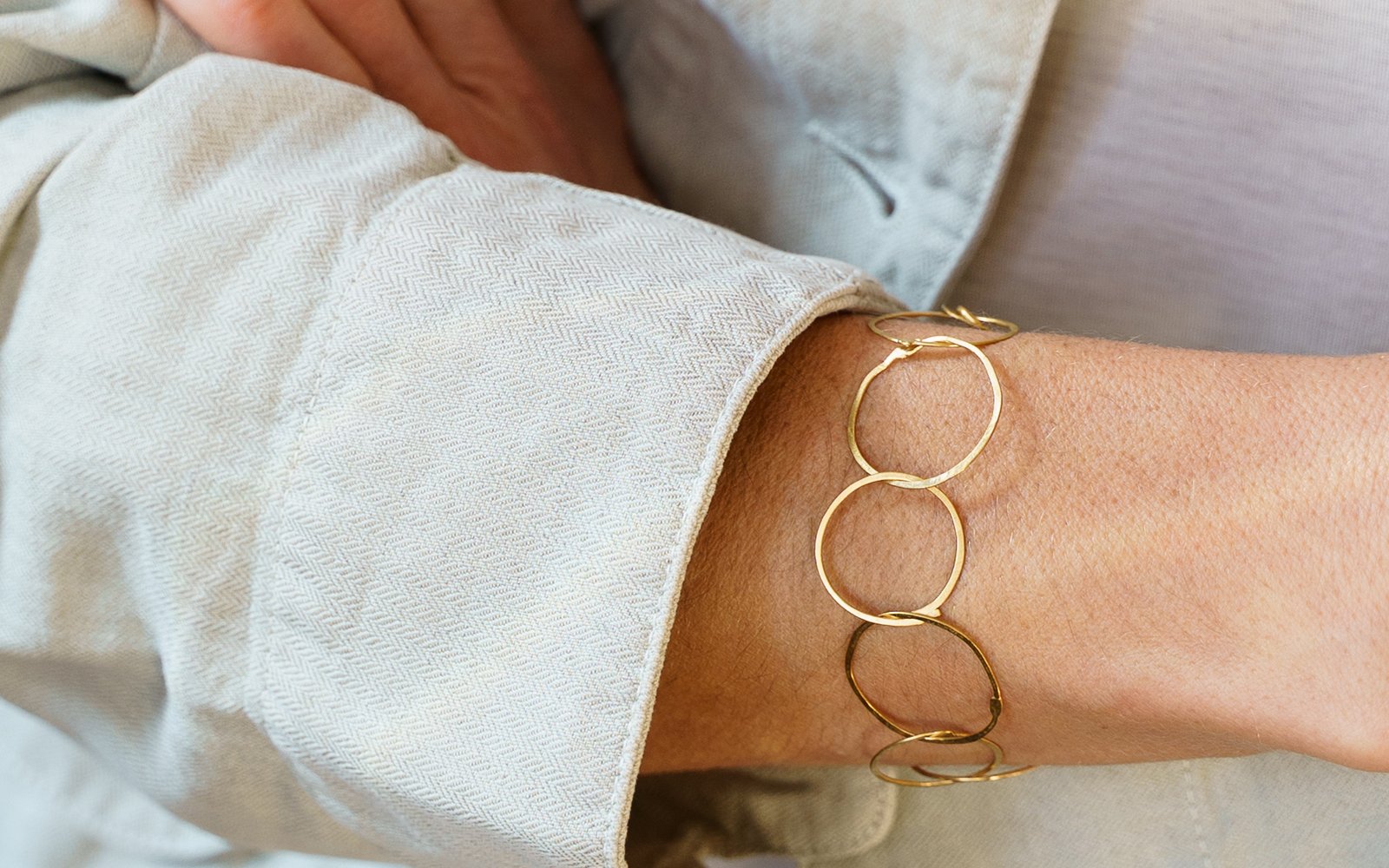 Das Armband “Cerchi” besteht aus unterschiedlich groβen Kreisen in 18 kt Gelbgold. Die Kreise sind gebogen, verlötet und flach geschmiedet. Die Schmiedespuren und Lötstellen sind sichtbar gelassen.