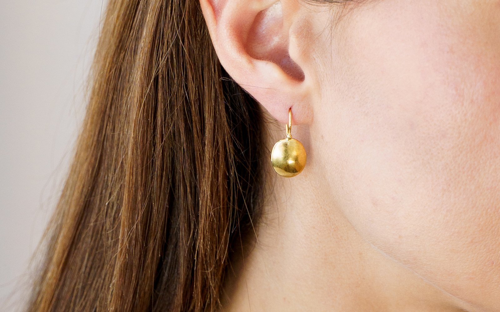 Oval, slightly convex earrings made from gold-plated silver. The silver has been rolled to a thickness of 0.8 mm. The oval shape has been cut out, ?led and hammered. The ovals are ?rmly attached to the ear hooks.