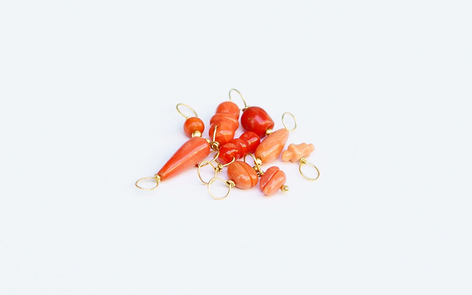 Piccoli pendenti in corallo antico con l’asola in oro 18 carati. Ogni ciondolo è unico.