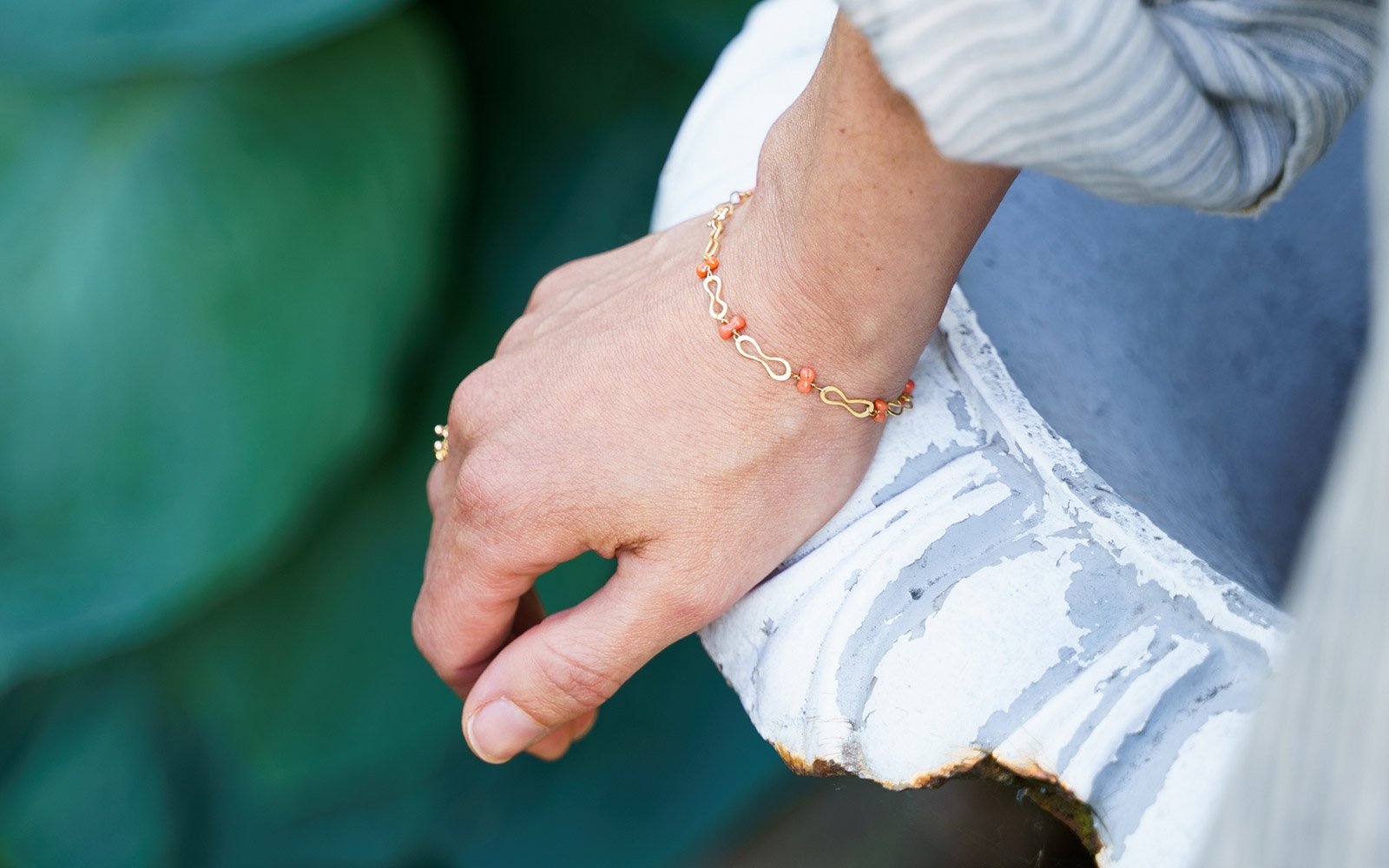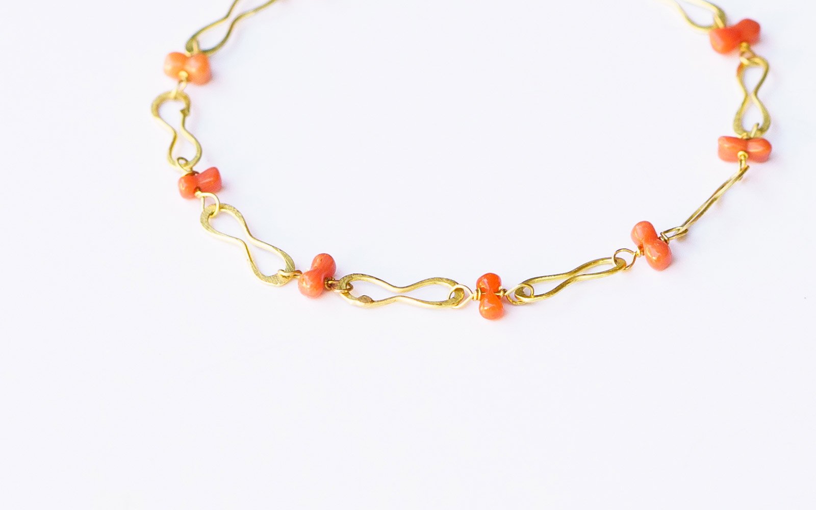 Il bracciale è composto da elementi forgiati in oro 18 carati lunghi 1,3 cm e da perline di corallo antico di varie forme.
