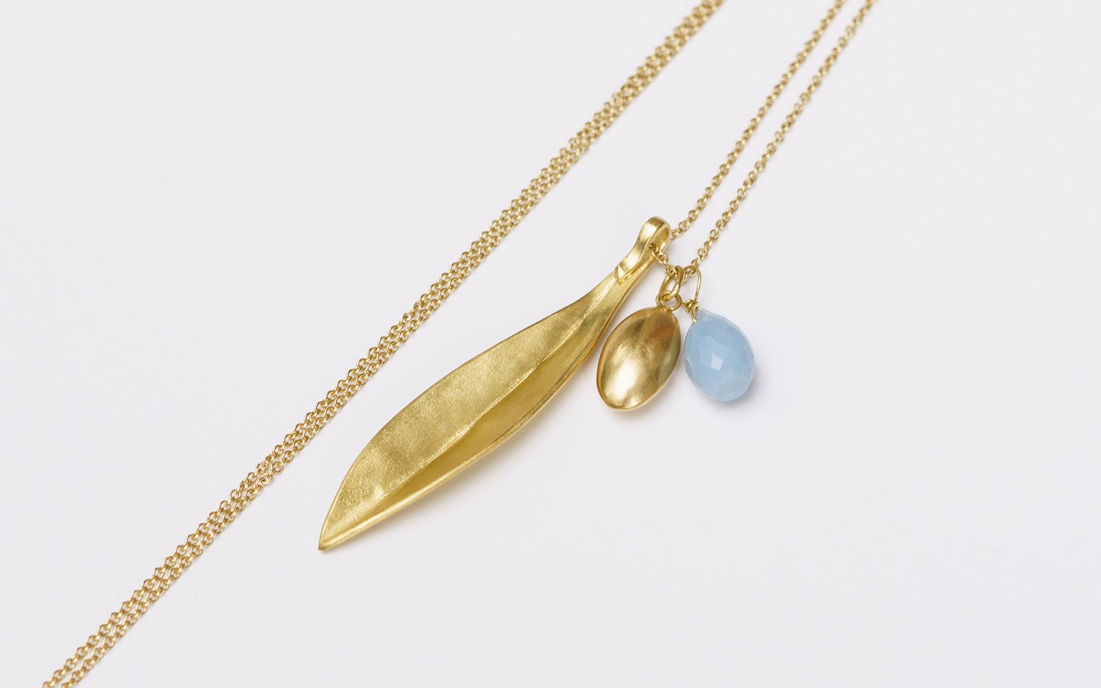 Foglia di Olivo in oro 18 ct. La forma del ciondolo viene prima lavorata in cera e poi fusa in oro, limata e lucidata.
