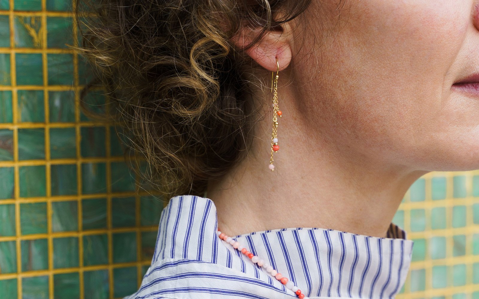 Earrings made from a fine anchor chain in 18-carat gold, antique coral beads and a gold pearl.
