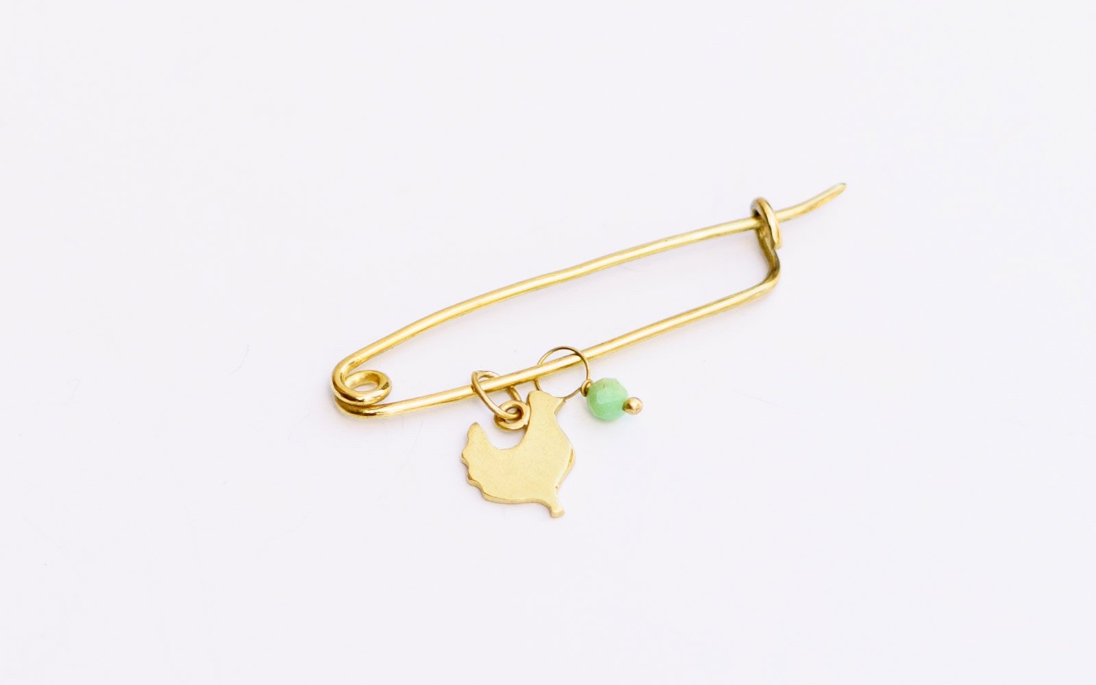 Spilla in oro realizzata a mano, a cui si possono appendere diversi ciondoli.