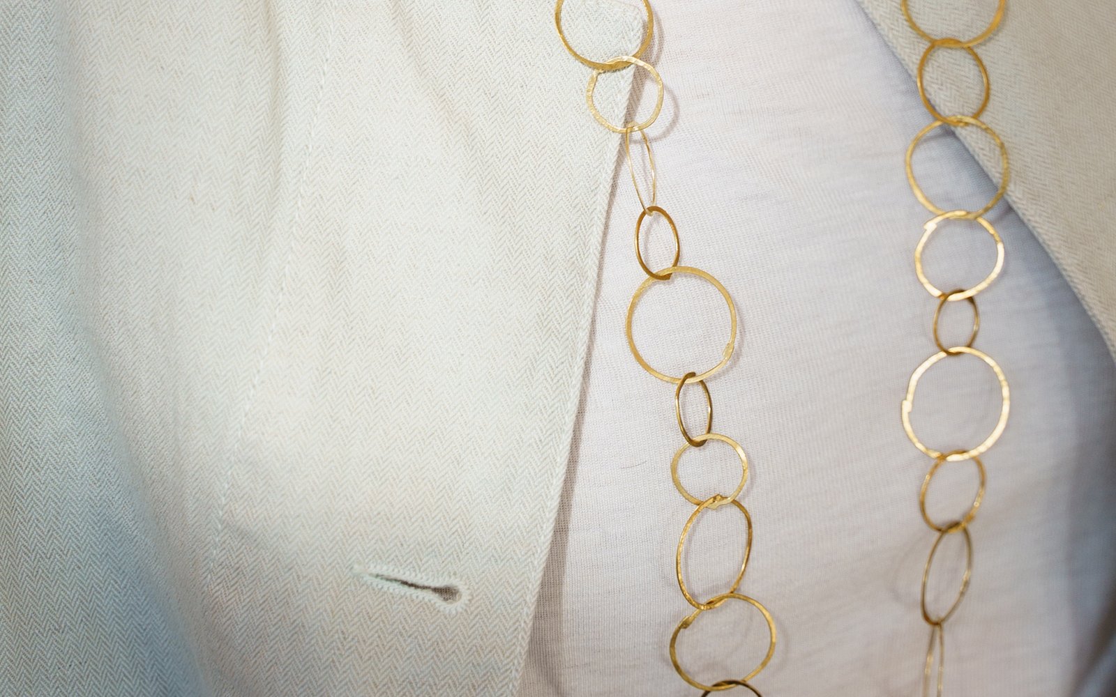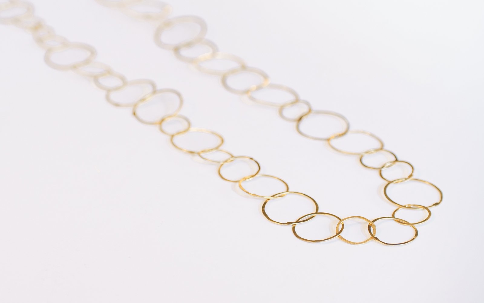 Die Kette ist aus 925 Silberdraht geschmiedet und anschliessend mittels Galvanik mit einer Schicht aus 750er Gelbgold überzogen.