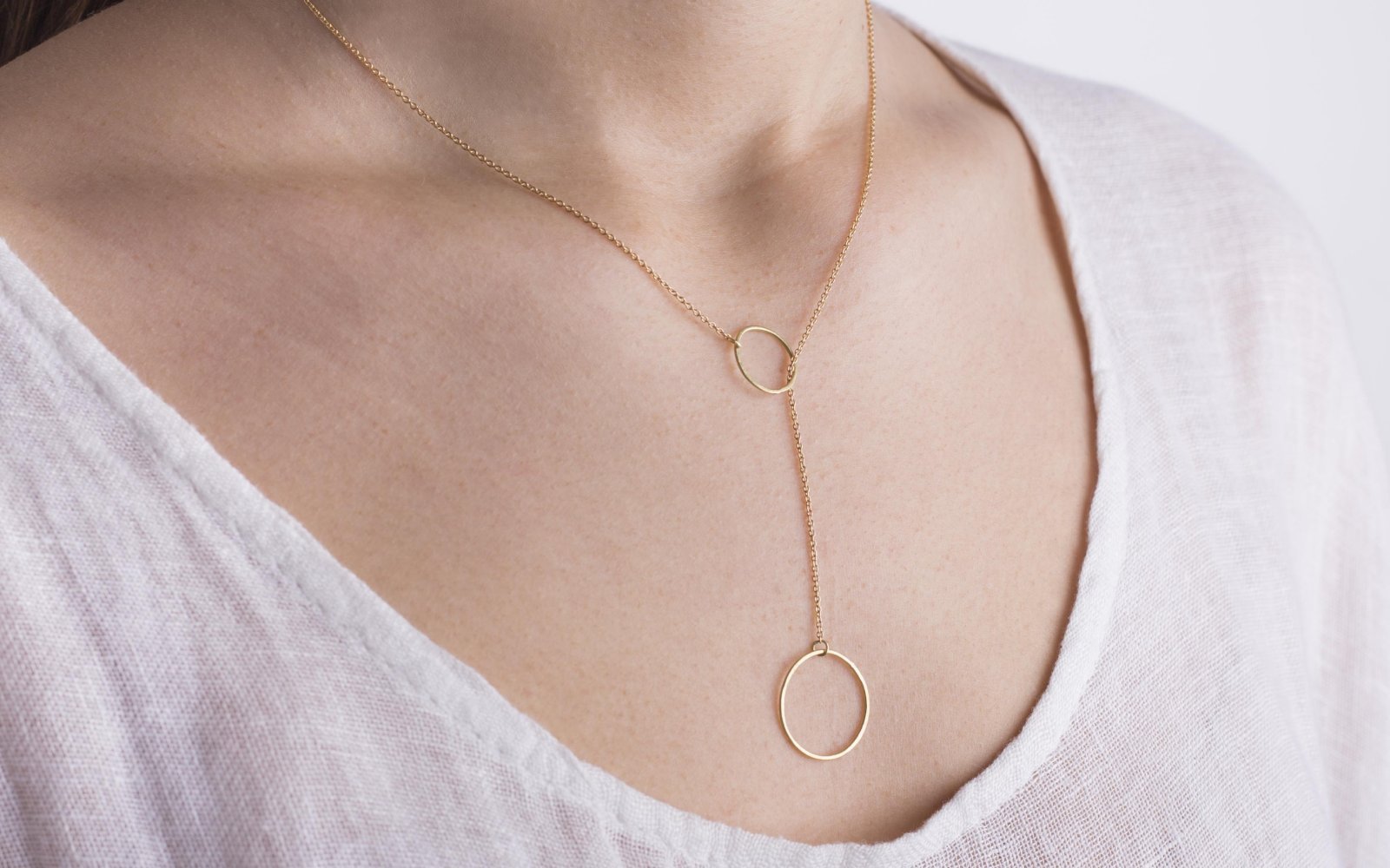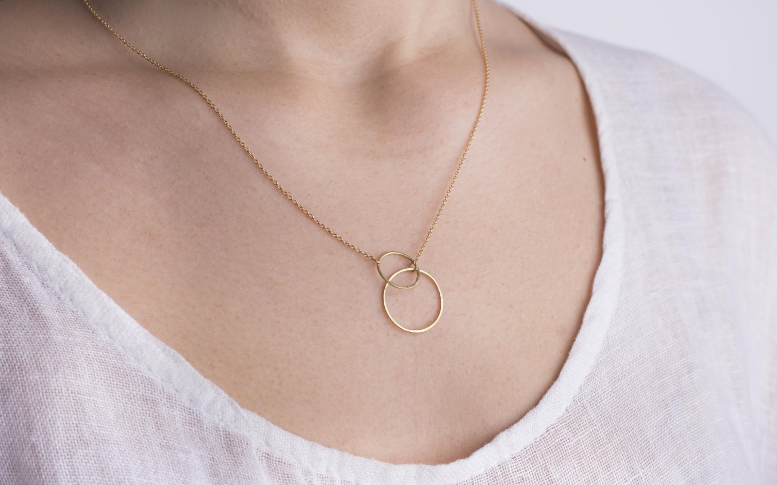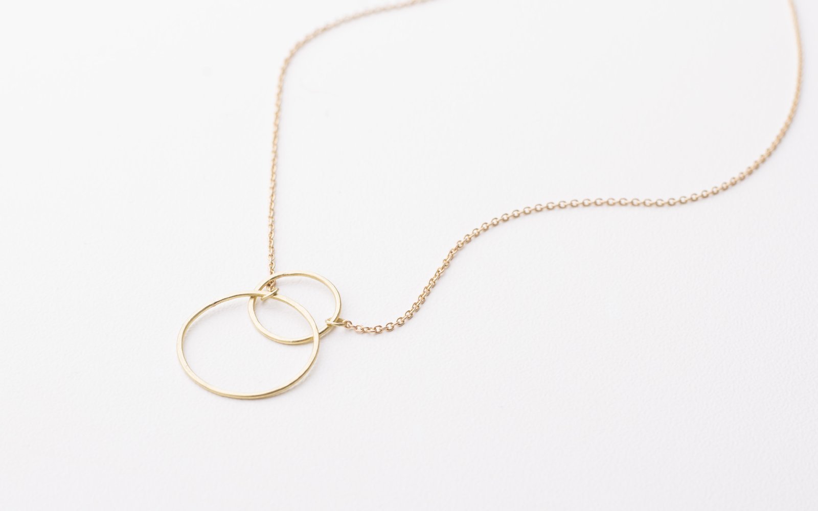 Fine chain in 18 ct gold with centrally integrated forged circles gold wire. The different sized circles are each attached to one end of the chain and can be changed in length. The necklace has a round 5 mm spring clasp in 18 ct gold.