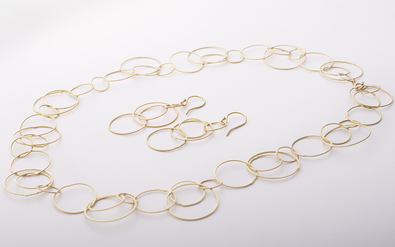 The earrings consist of four circles with different size, in 18 ct gold. The circles are bent, soldered together and flat forged. Traces from forging and solder joints are left visible. The earrings are movably hung on an ear hook.