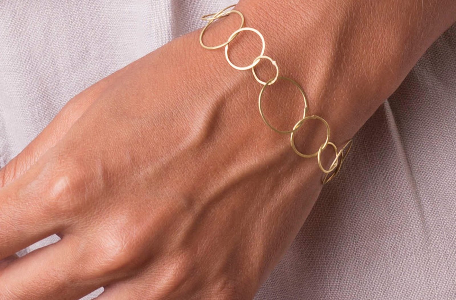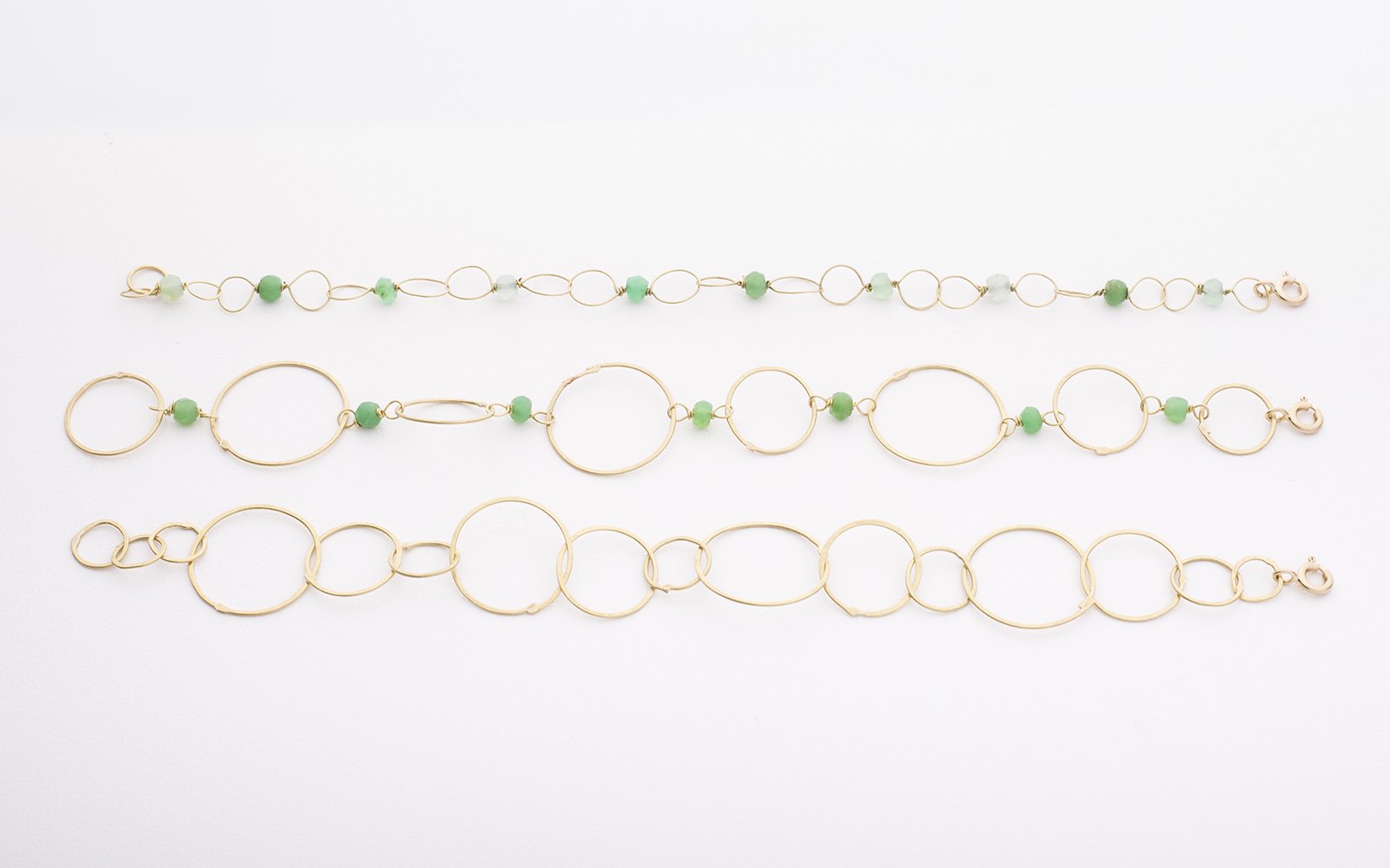 The bracelet “Cerchi” consists of different sized circles in 18 ct gold. The circles are bent, soldered and forged flat. The traces from forging and solder joints are left visible. The bracelet has a round 5 mm spring clasp in 18 ct gold.
