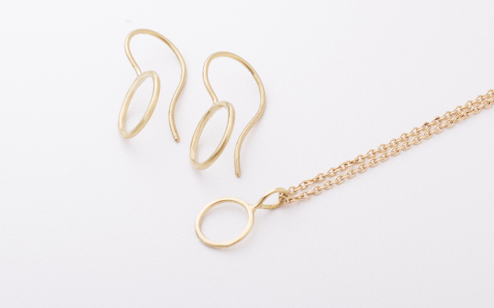 Circular earrings in 18 ct gold. The circles are bent from gold wire, soldered and forged slightly flat. Traces from forging are left visible. The circle is firmly soldered with theear hook.