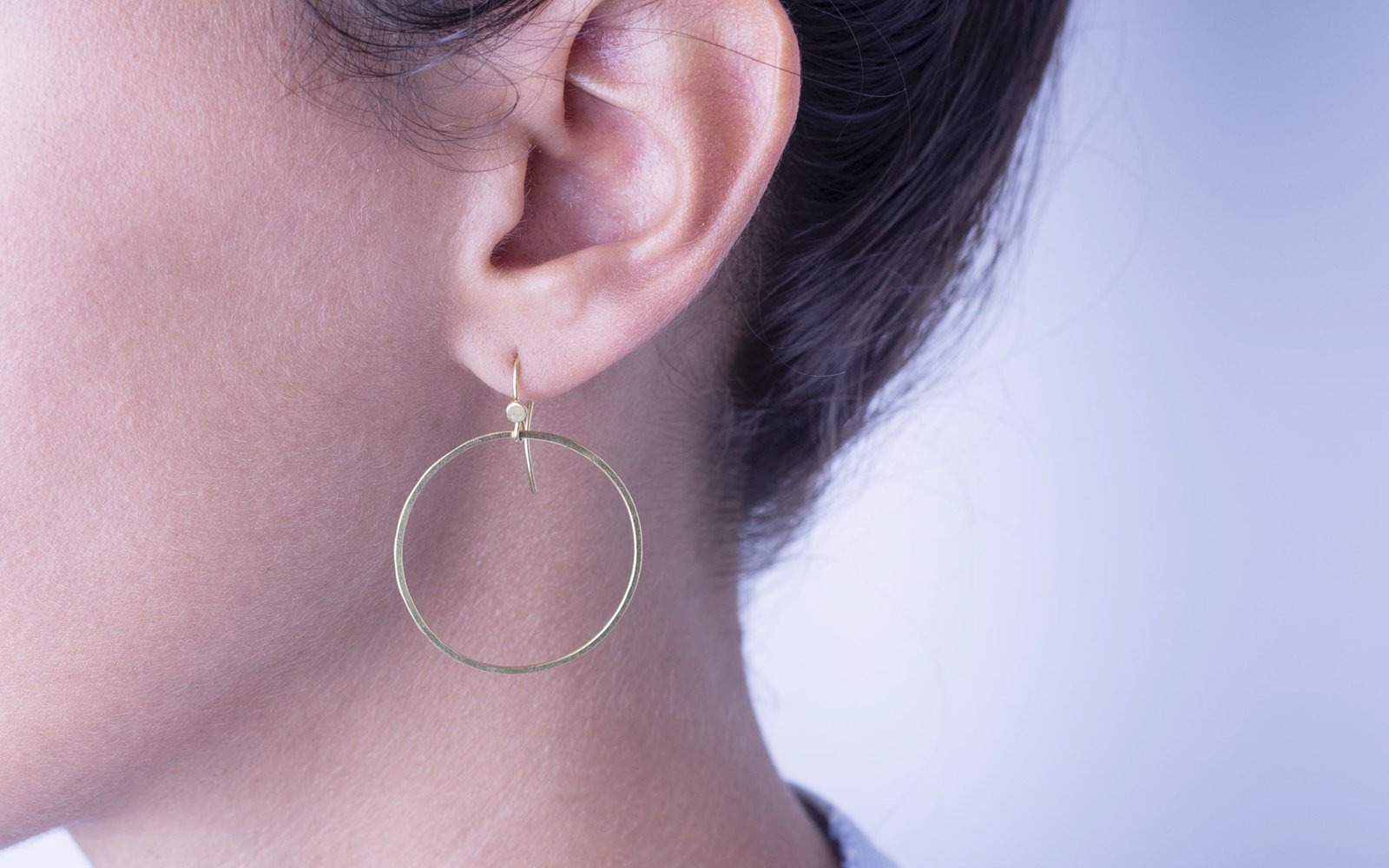 18 ct gold circle earrings. The gold is a 1.2 mm wire, bent into a circle, soldered and hammered lightly flat. The traces of forging are left visible. The hoop hangs movably in the ear hook, which ends on a small hammered plate.