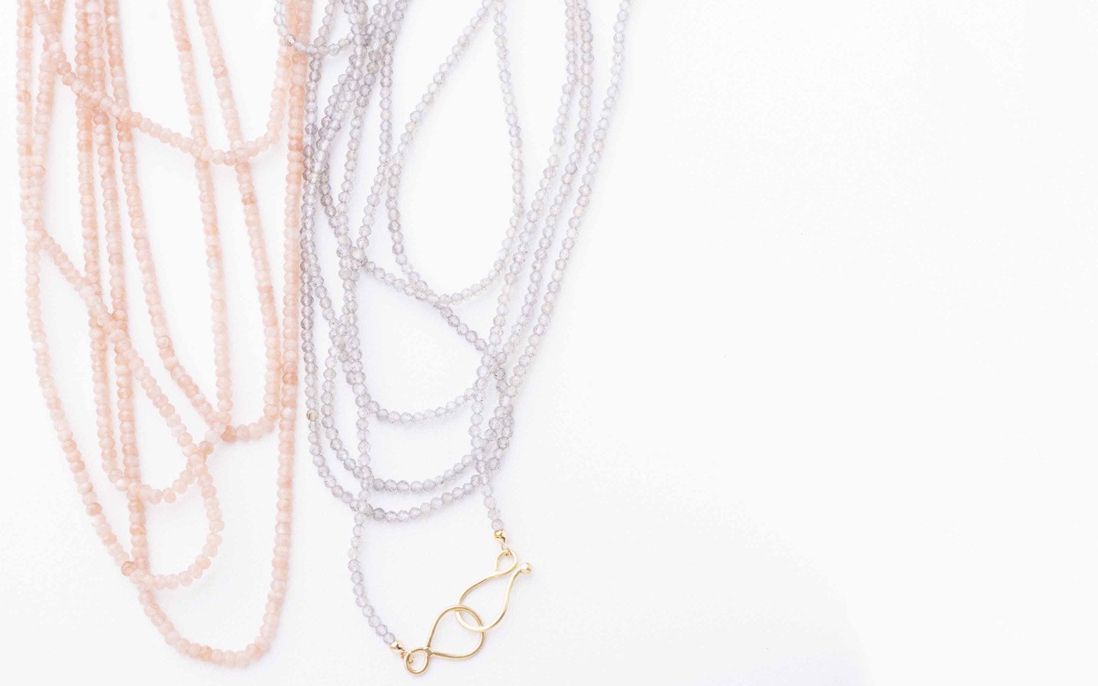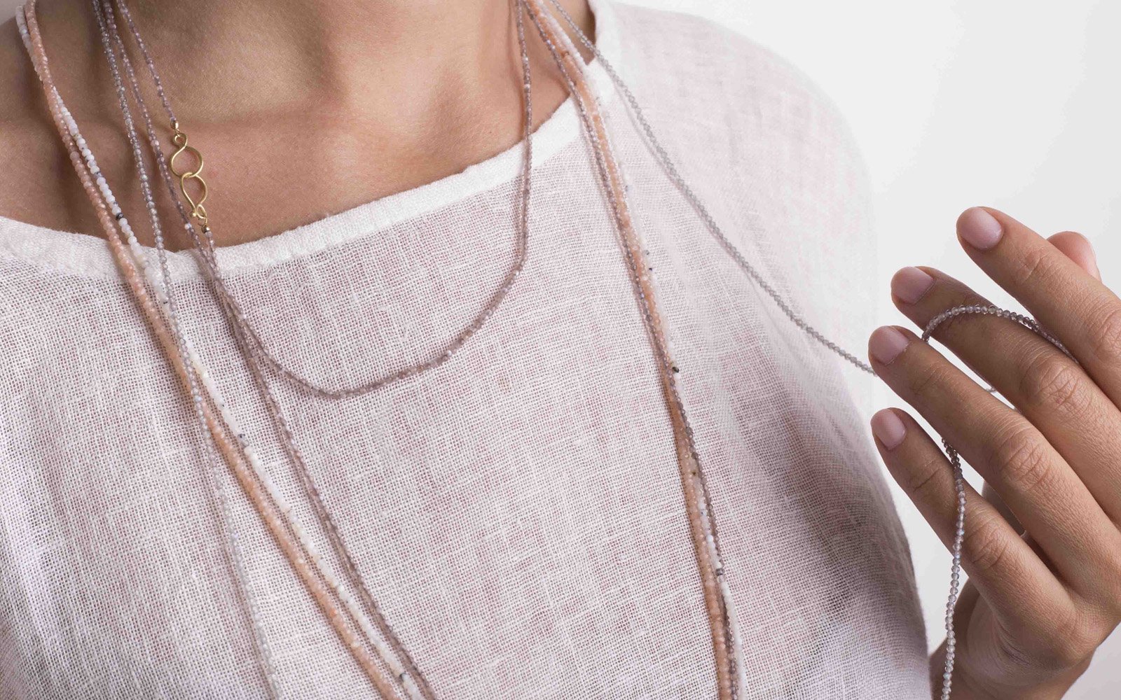 A long necklace of different natural small beads. The beads are threaded on a stable silk thread. The forged clasp in 18 ct gold is attached to the necklace through gold beaded terminals.