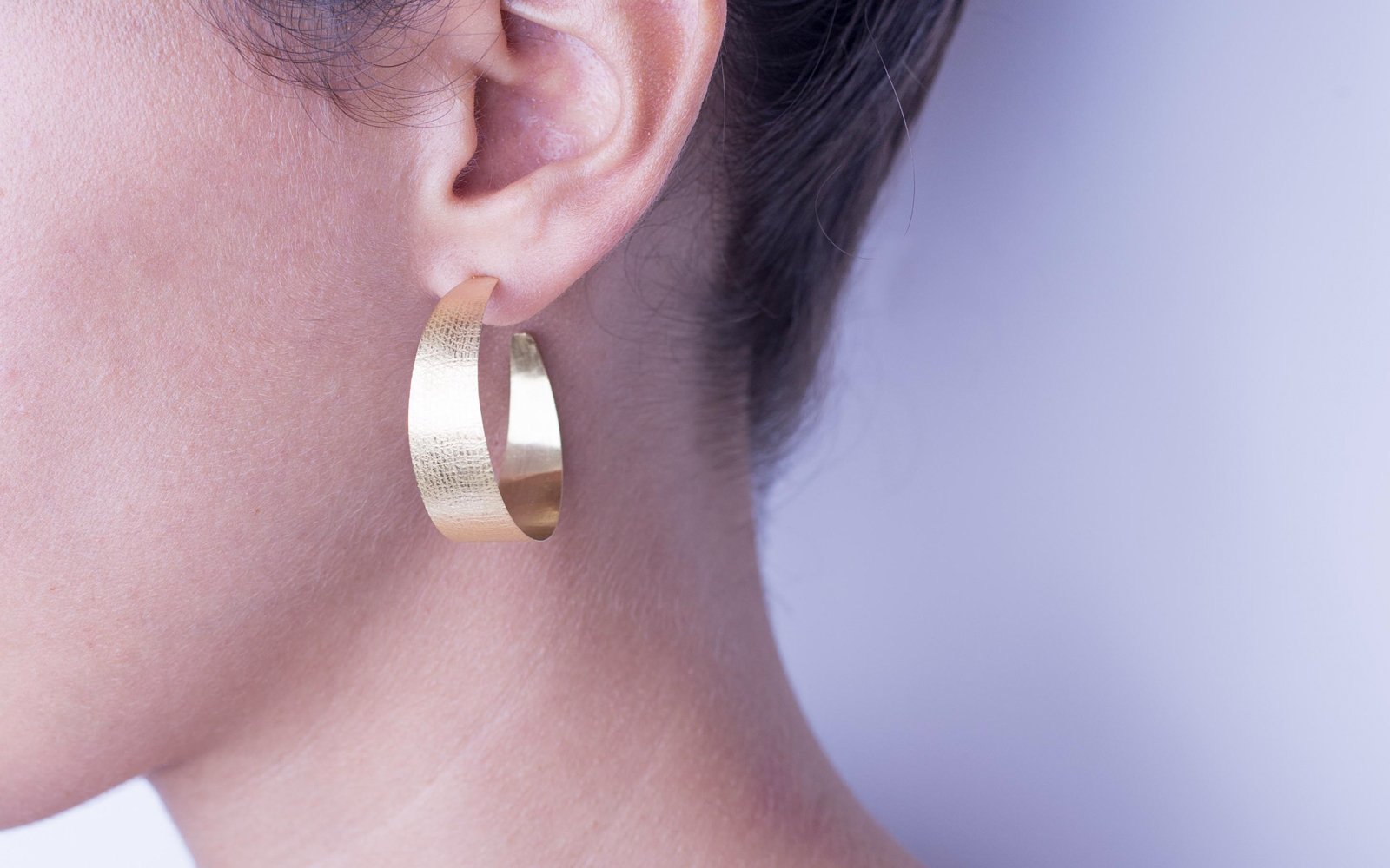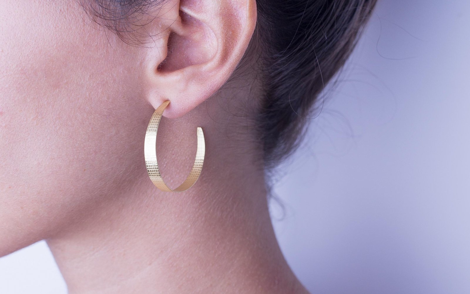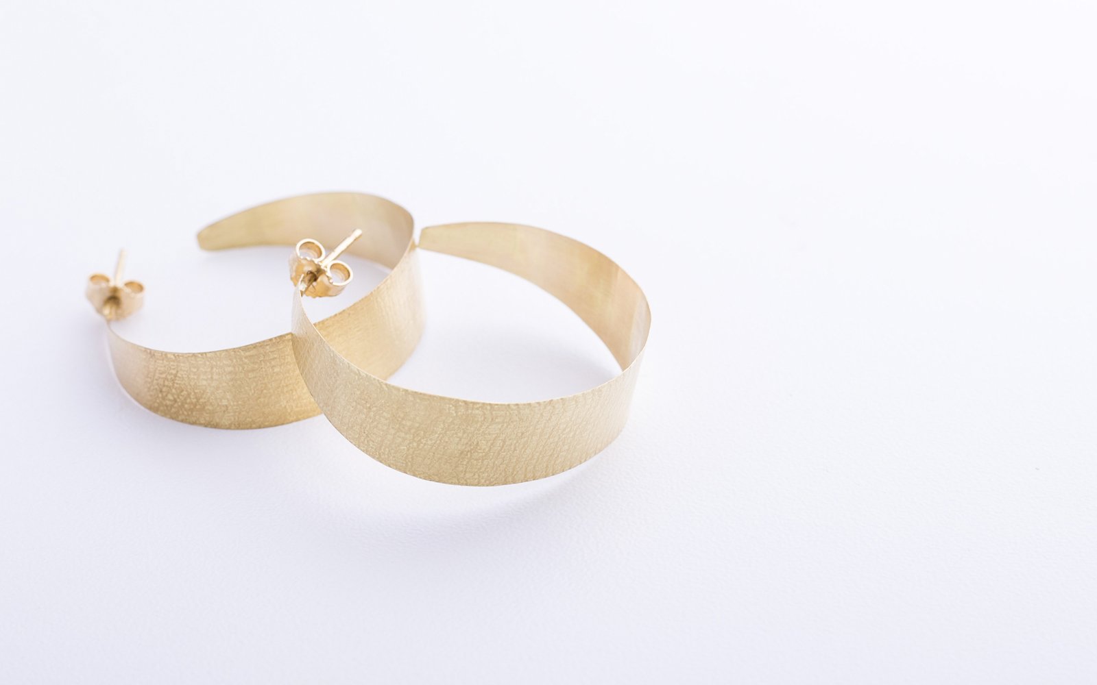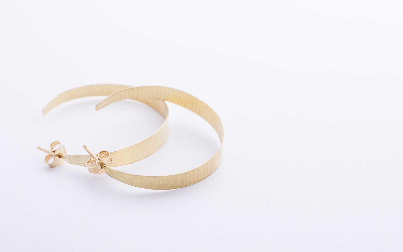 18 ct gold Creoles. The gold sheet is rolled to a thickness of 0.2 mm and bent into creoles with a diameter of 3,5 cm. The surface has a drawn, slightly fluted structure with a satin sheen. The ear nut is also made of 18 ct gold.