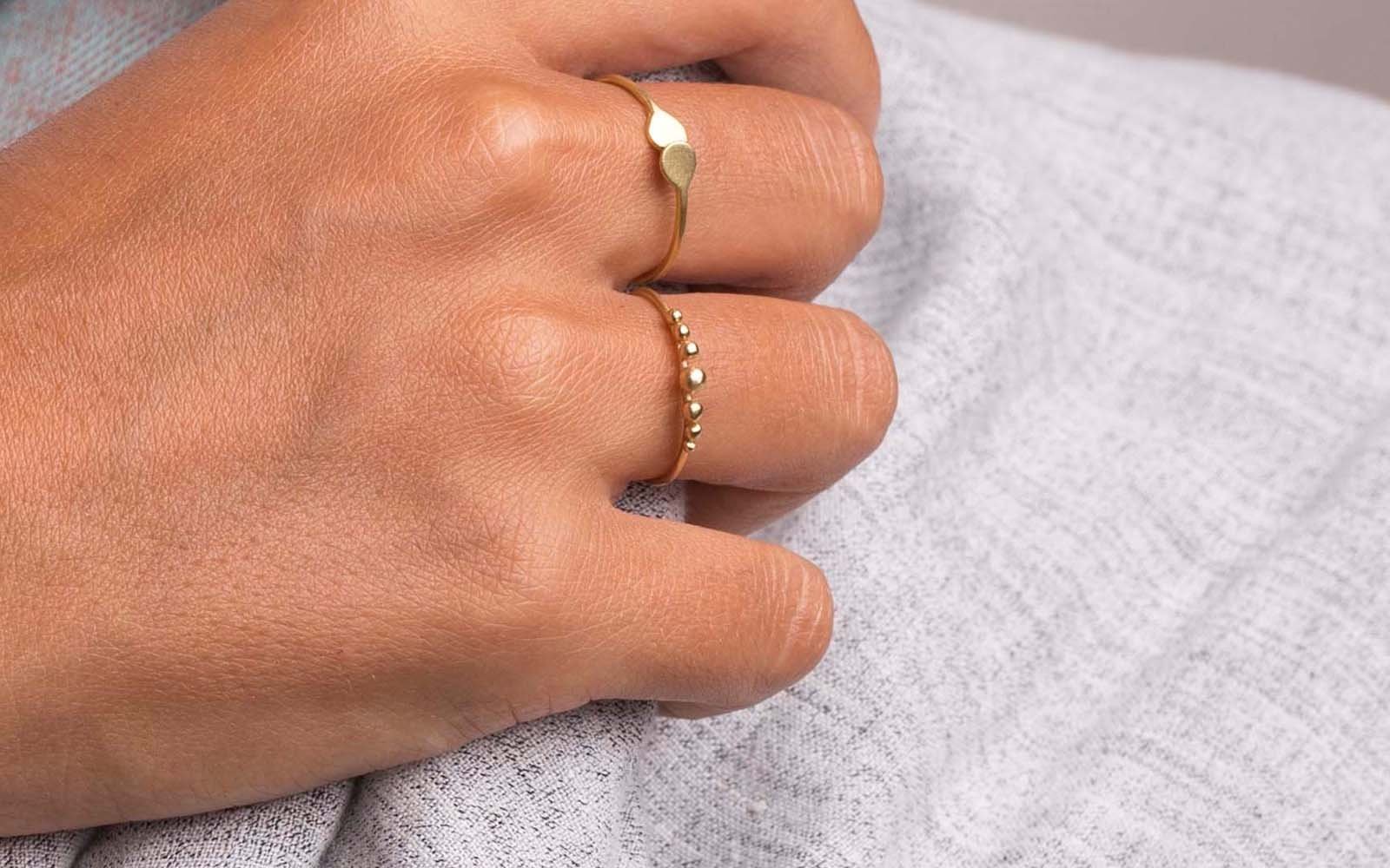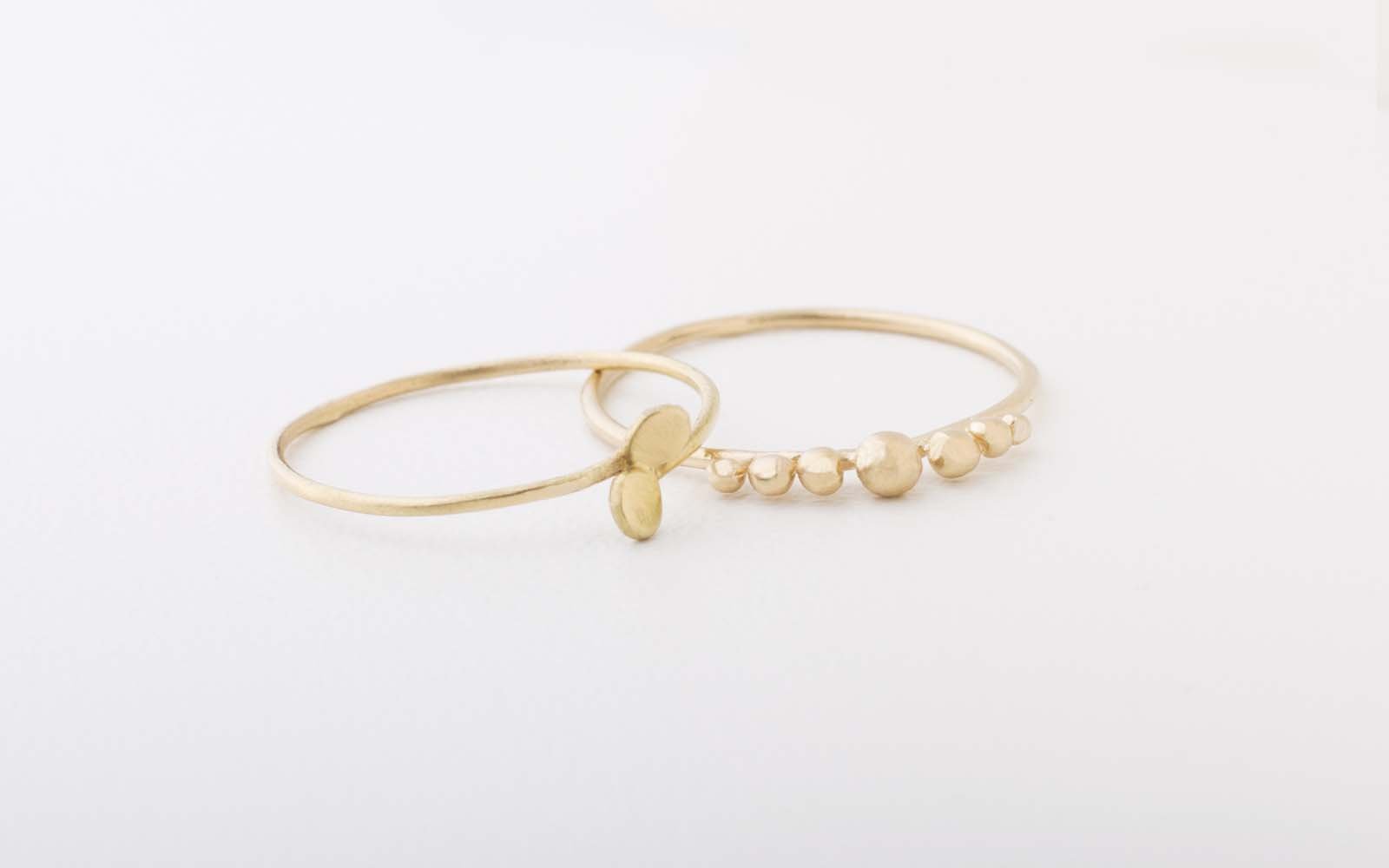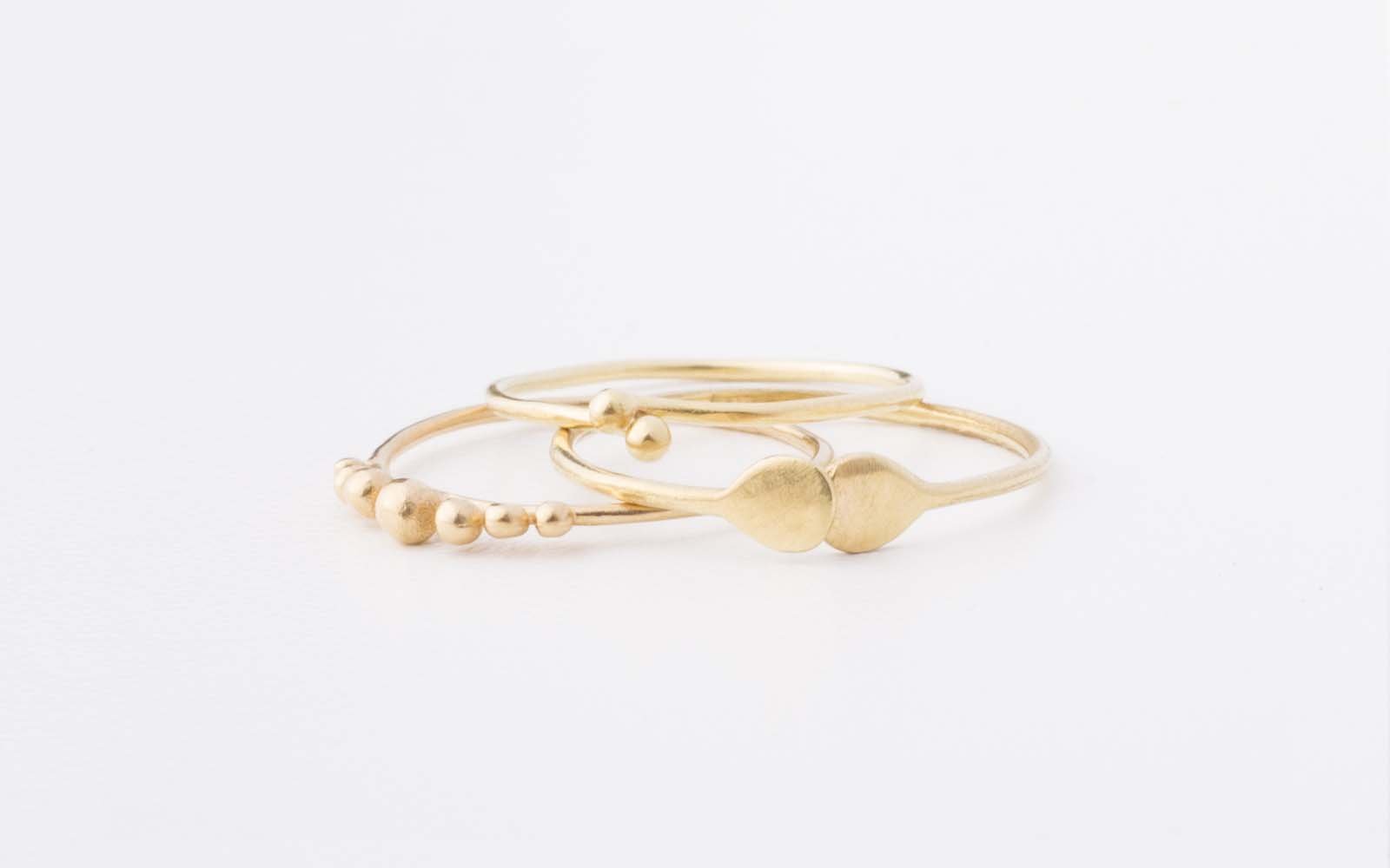 Small ring in 18 ct gold. Seven forged globules in different sizes are soldered together in the middle of the ring. Traces from forging are left visible, the surface is satin matt.