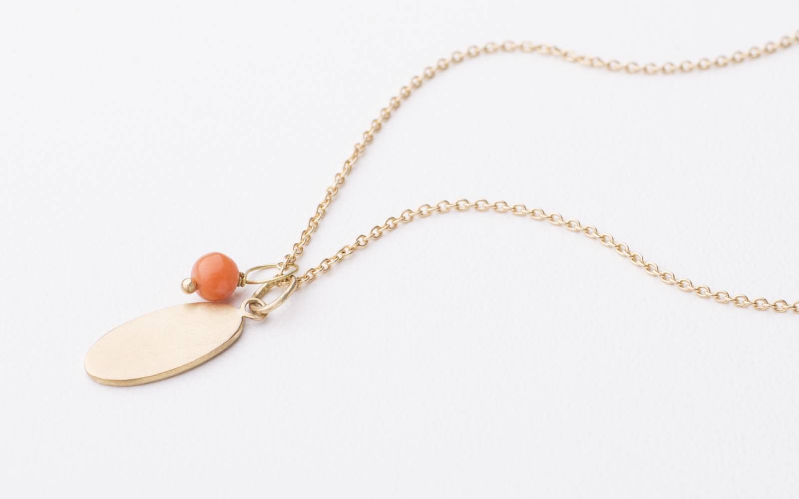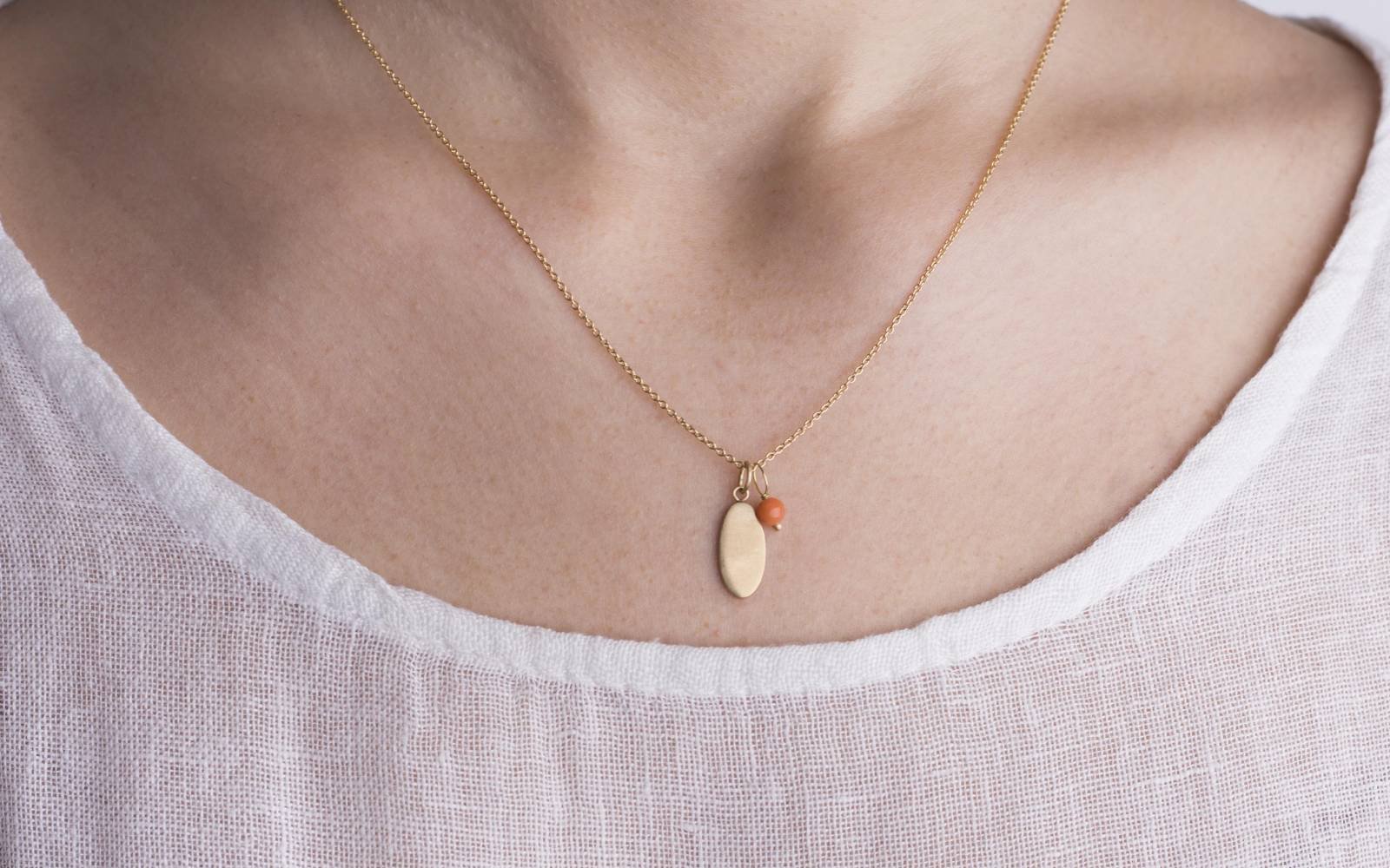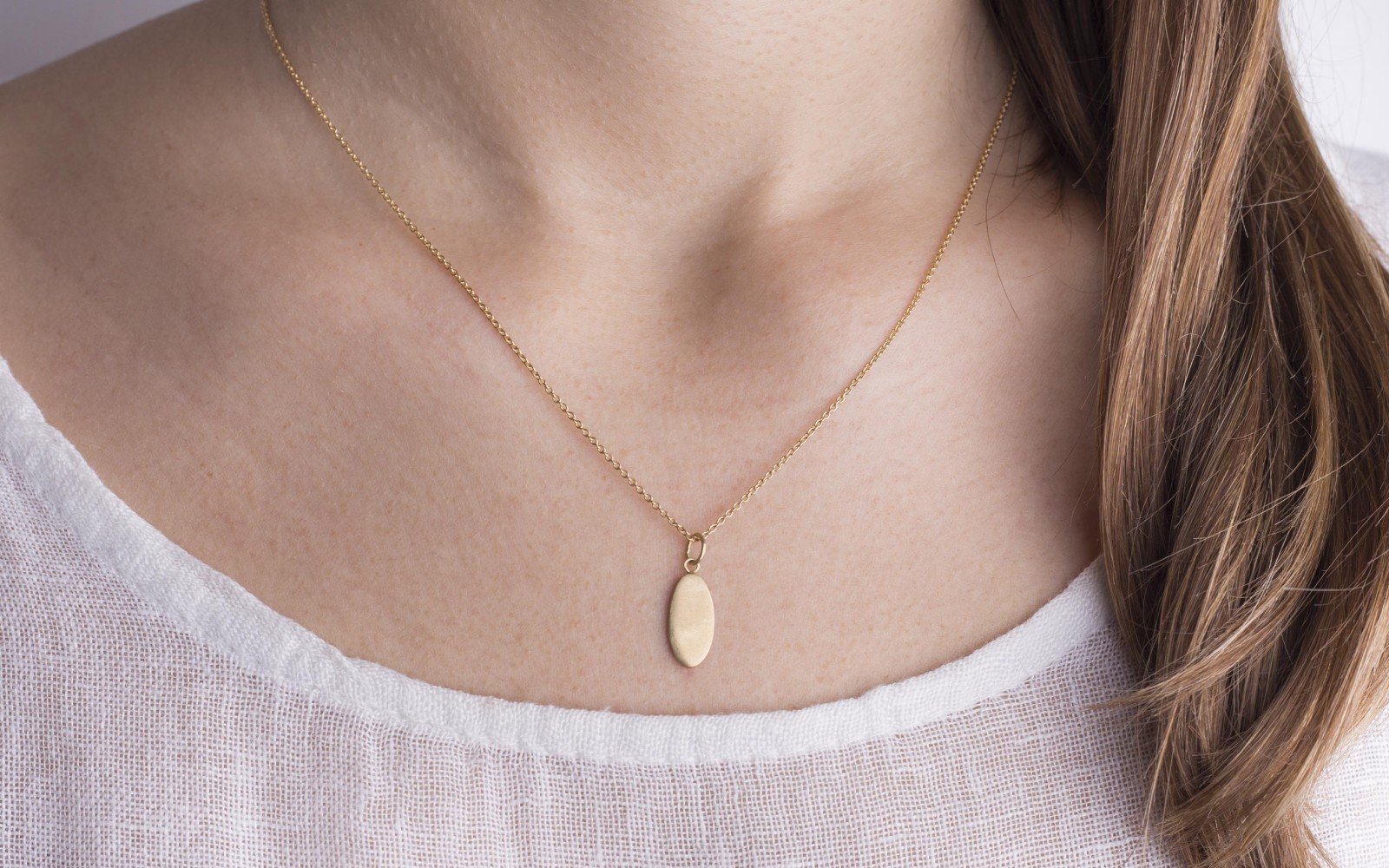 Fine 1 mm necklace in 18 ct gold with an elliptical-shaped pendant. The gold is rolled to 1 mm thickness. The elliptic form is sawn out, filed and flat hammered. It hangs on a small eyelet movably attached to the necklace. The necklace has a 5 mm round spring clasp in 18 ct gold.