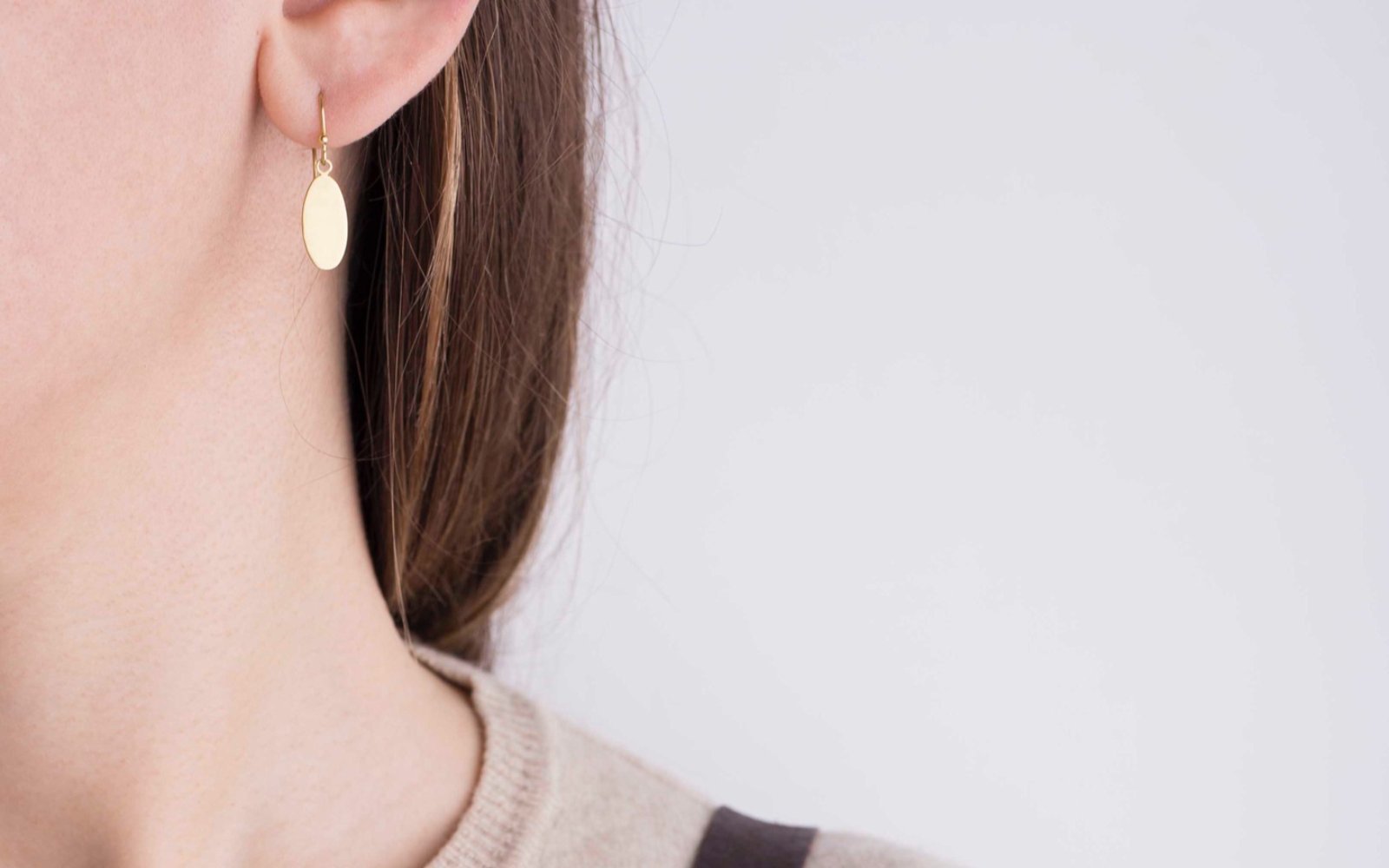 Elliptical-shaped earrings in 18 ct gold. The gold is rolled to 1 mm thickness. The elliptic form is sawn out, filed and flat hammered. Traces from forging are slightly left visible. The ellipse are movably connected with the ear hooks through a small eyelet.