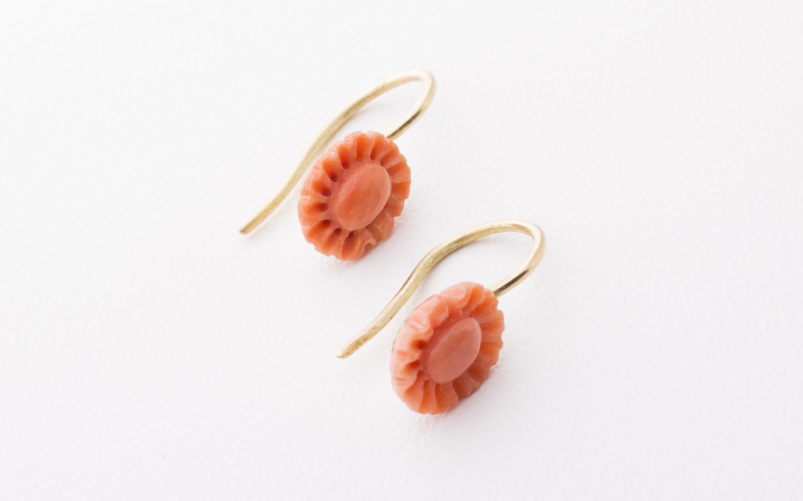 The earrings consist of an antique and hand-polished flower shaped coral. The gemstone is mounted on 18 ct gold hand-forged ear hangers. The coral is hand-cut.