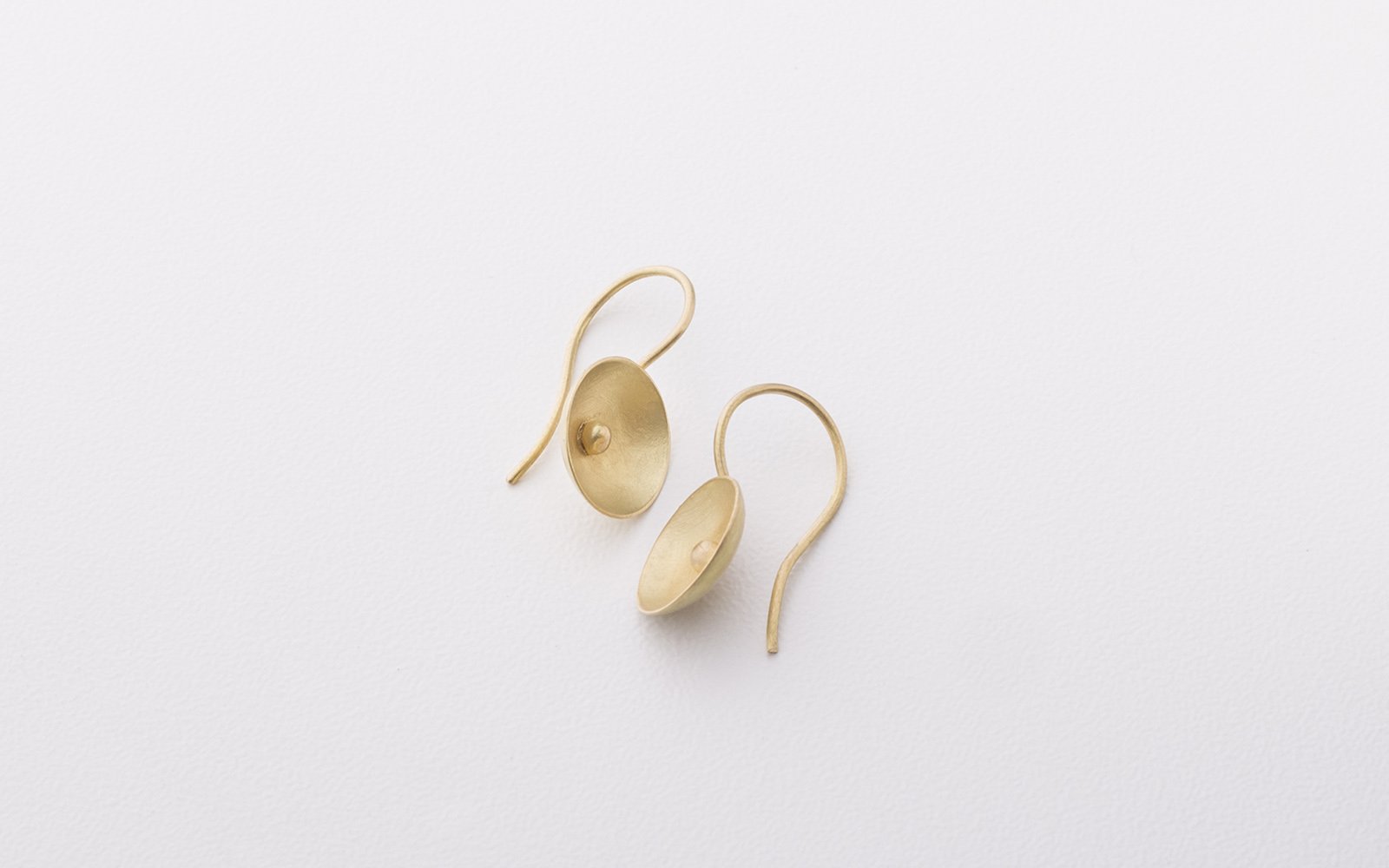 Flower shaped earrings in 18 ct gold. A small gold pearl is soldered into the centre of the concavely forged form. The flowers firmly connected to the ear hook.