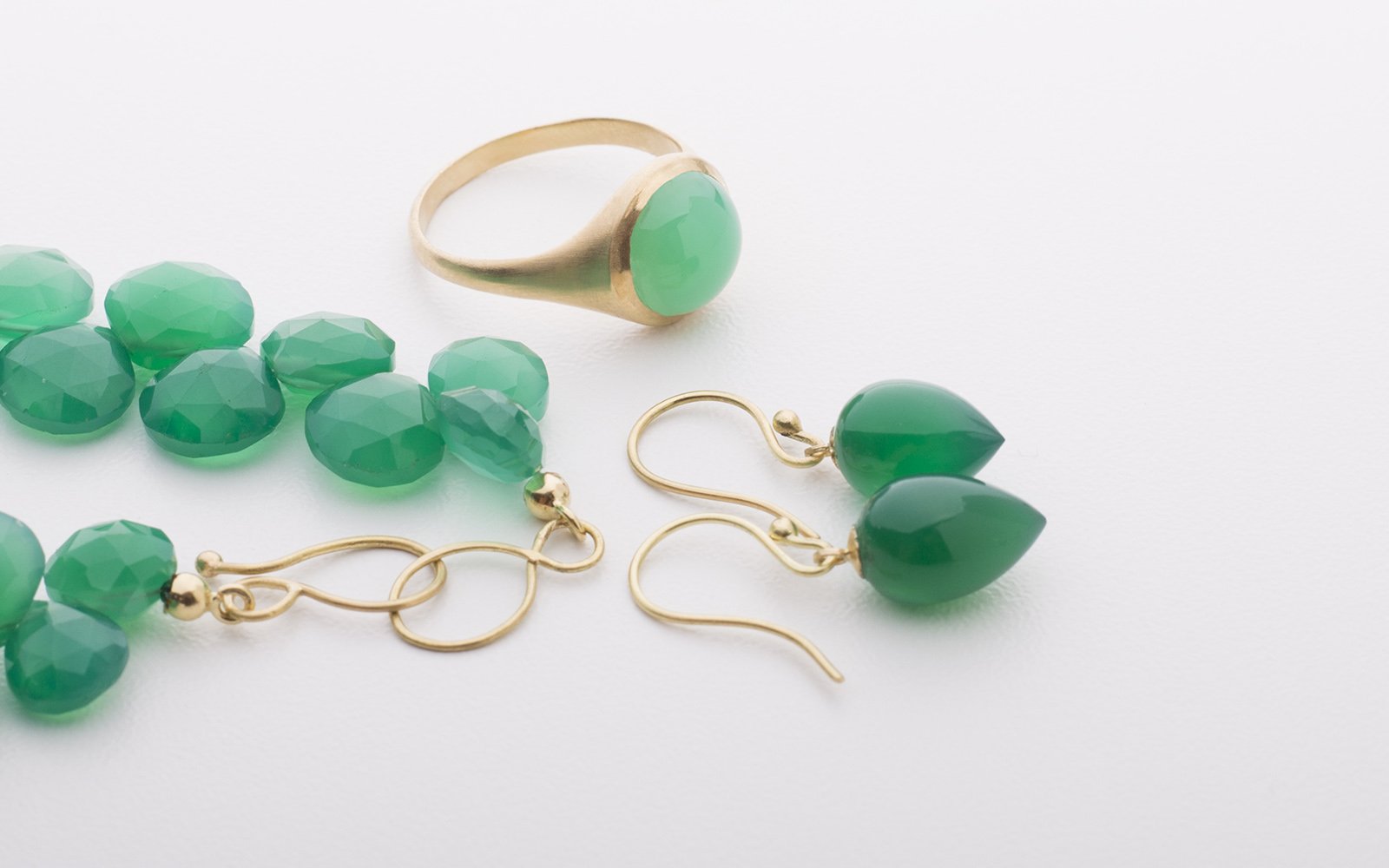 Bracelet made of drop-shaped green Onyx with a forged clasp in 18 ct gold. The gemstones are threaded on a steel thread. The clasp is attached to the bracelet through small gold beads. Size of the stones: 8 mm