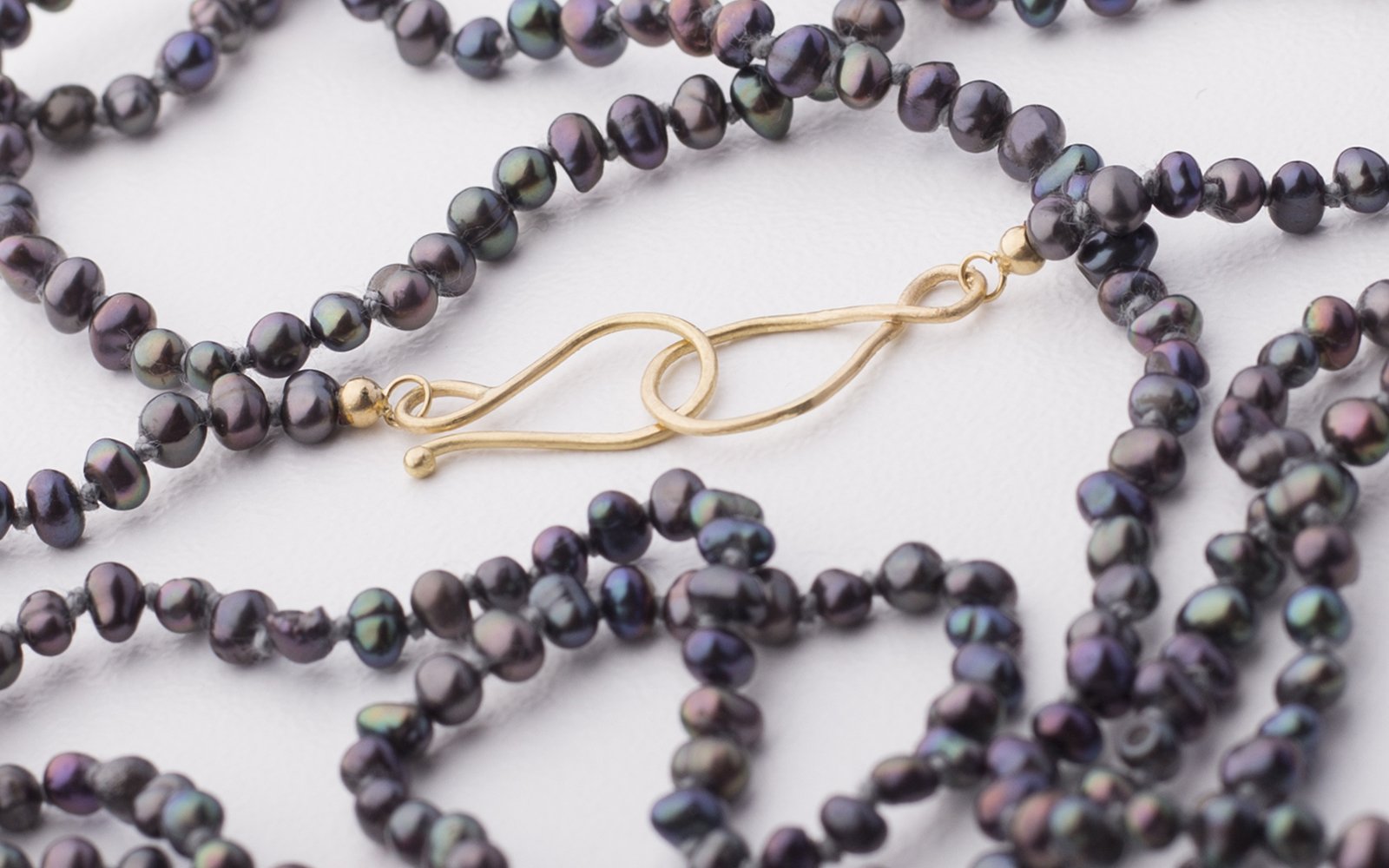 A long necklace of fresh water pearls in slightly irregular oval form. The colours are changing between black and blue. The pearls are threaded on a stable silk thread. The forged clasp in 1 ct gold is attached to the necklace through small gold pearls.