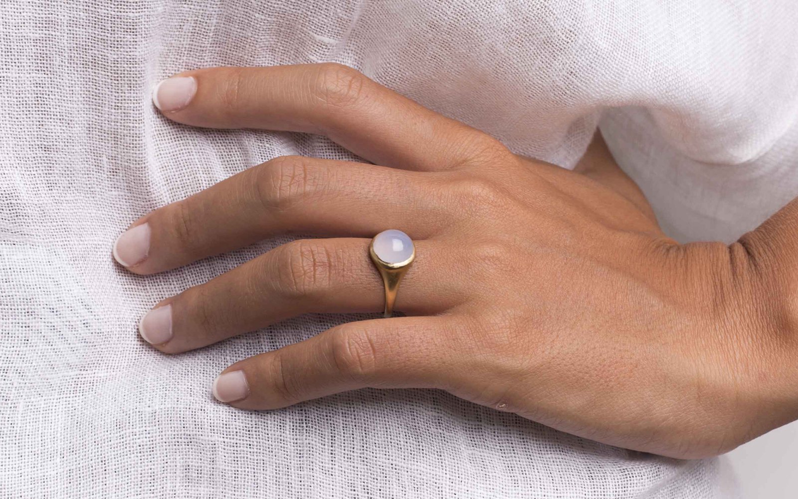 Anello in oro 18 ct con pietra tagliata a cabochon. La pietra è trattenuta dal bordo superiore del castone. Il lato inferiore del castone è aperto per consentire alla luce di illuminare la pietra.