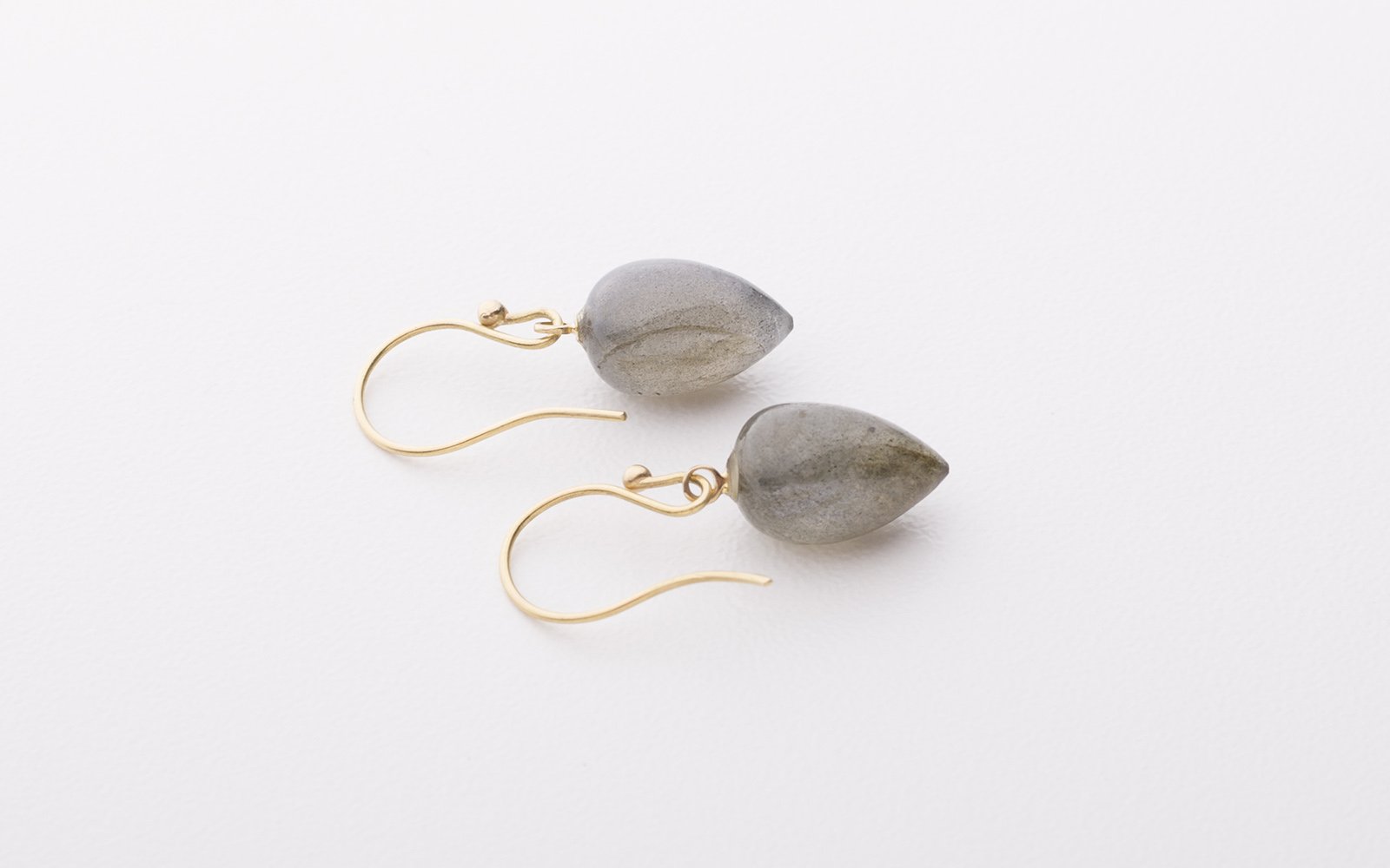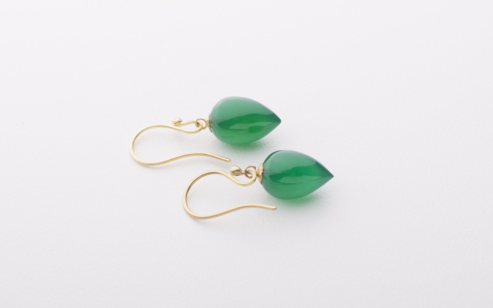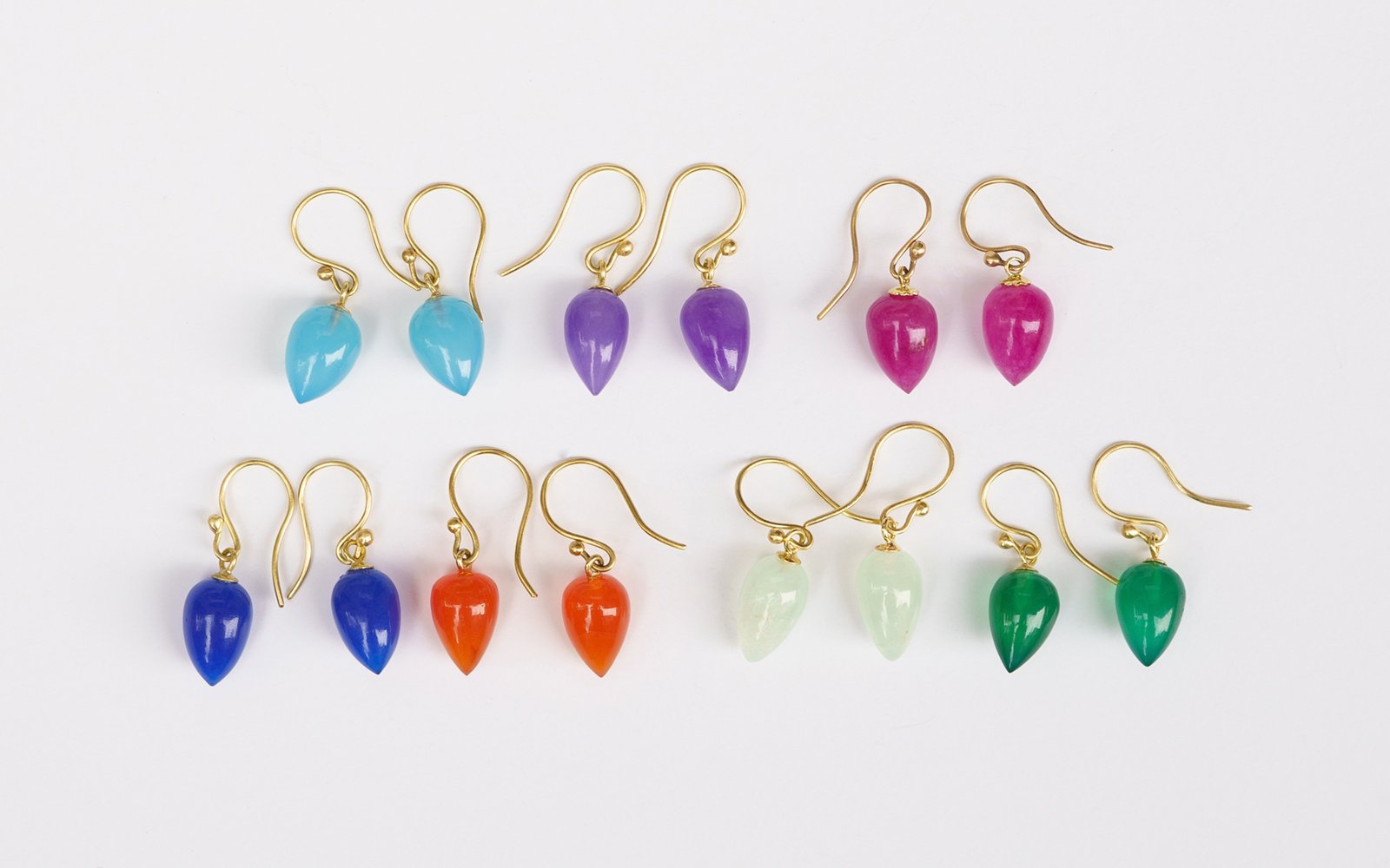 Cone shaped smoothly forged gemstones. The stones are movably connected with the ear hook in 18 ct goldthrough a small eyelet.