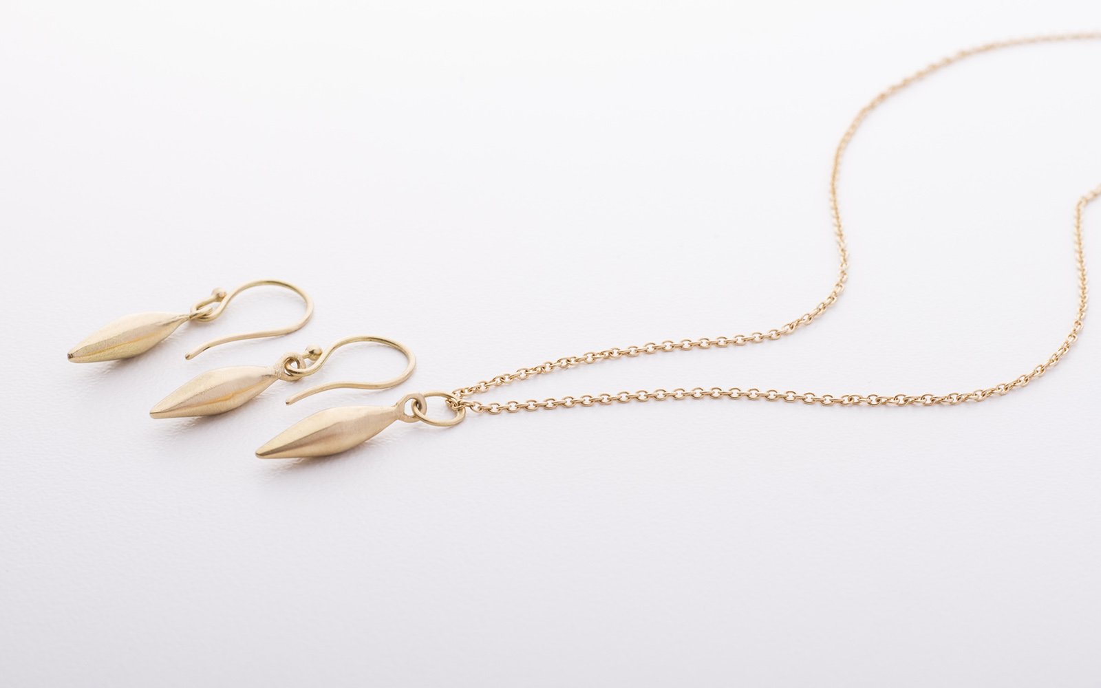 Earrings in 18 ct gold. The elongated form of Pinolo (pine nut) is first worked in wax and then cast in solid gold, filed and polished. The earrings are movably connected with the ear hook.