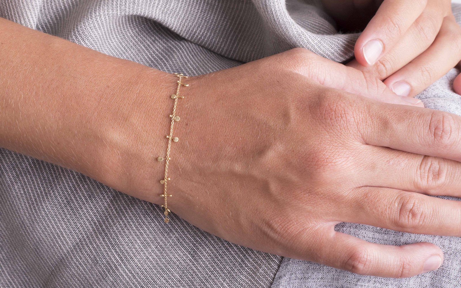 Fine bracelet made in 18 ct gold and inserted 2 mm tiny platelets. The platelets are hammered flat, the traces from forging are left visible. The bracelet has a round 5 mm spring clasp in 18 ct gold.