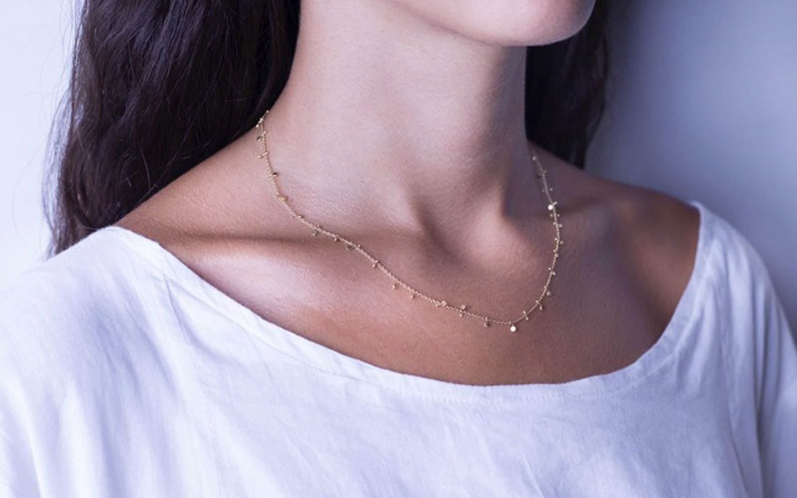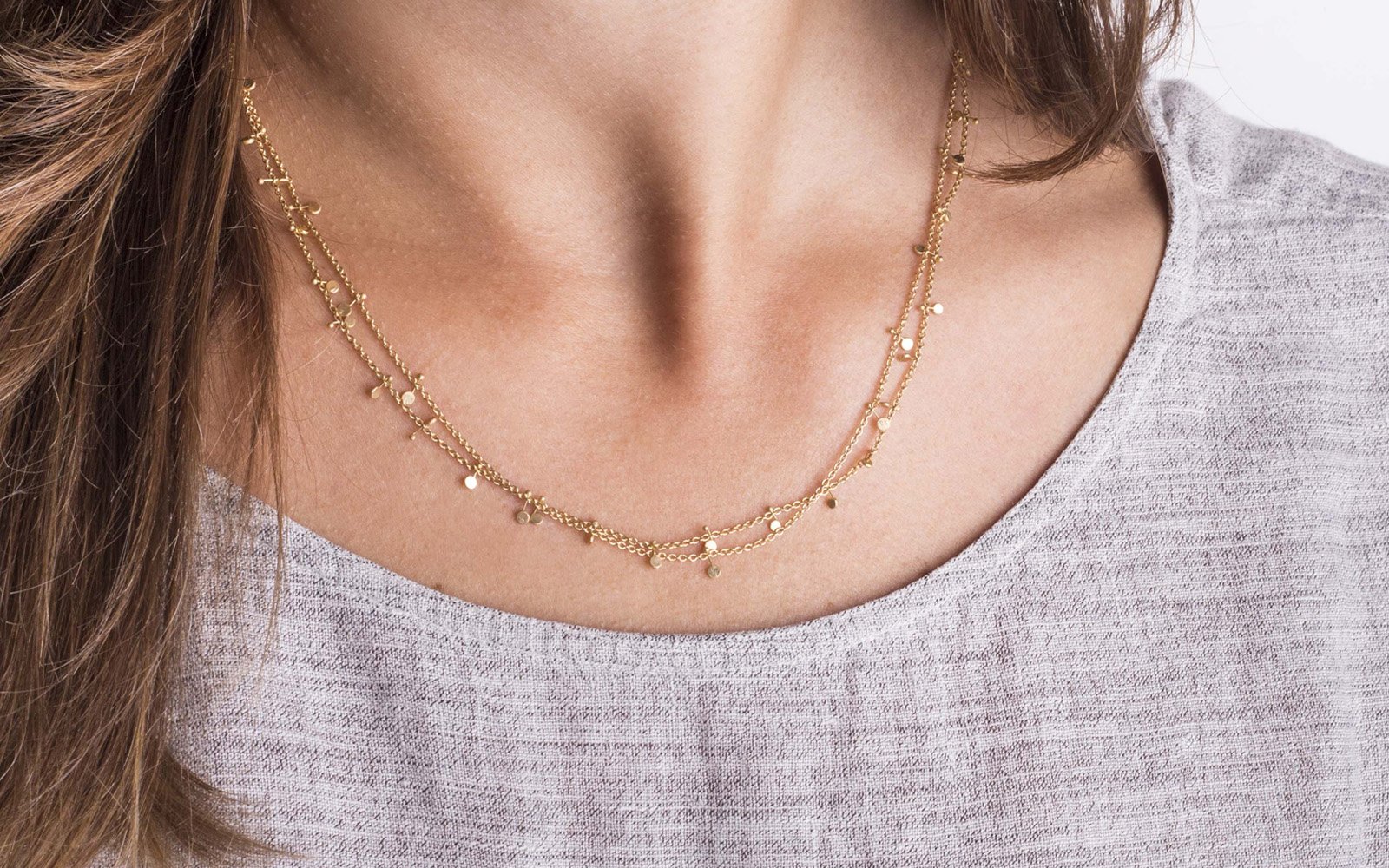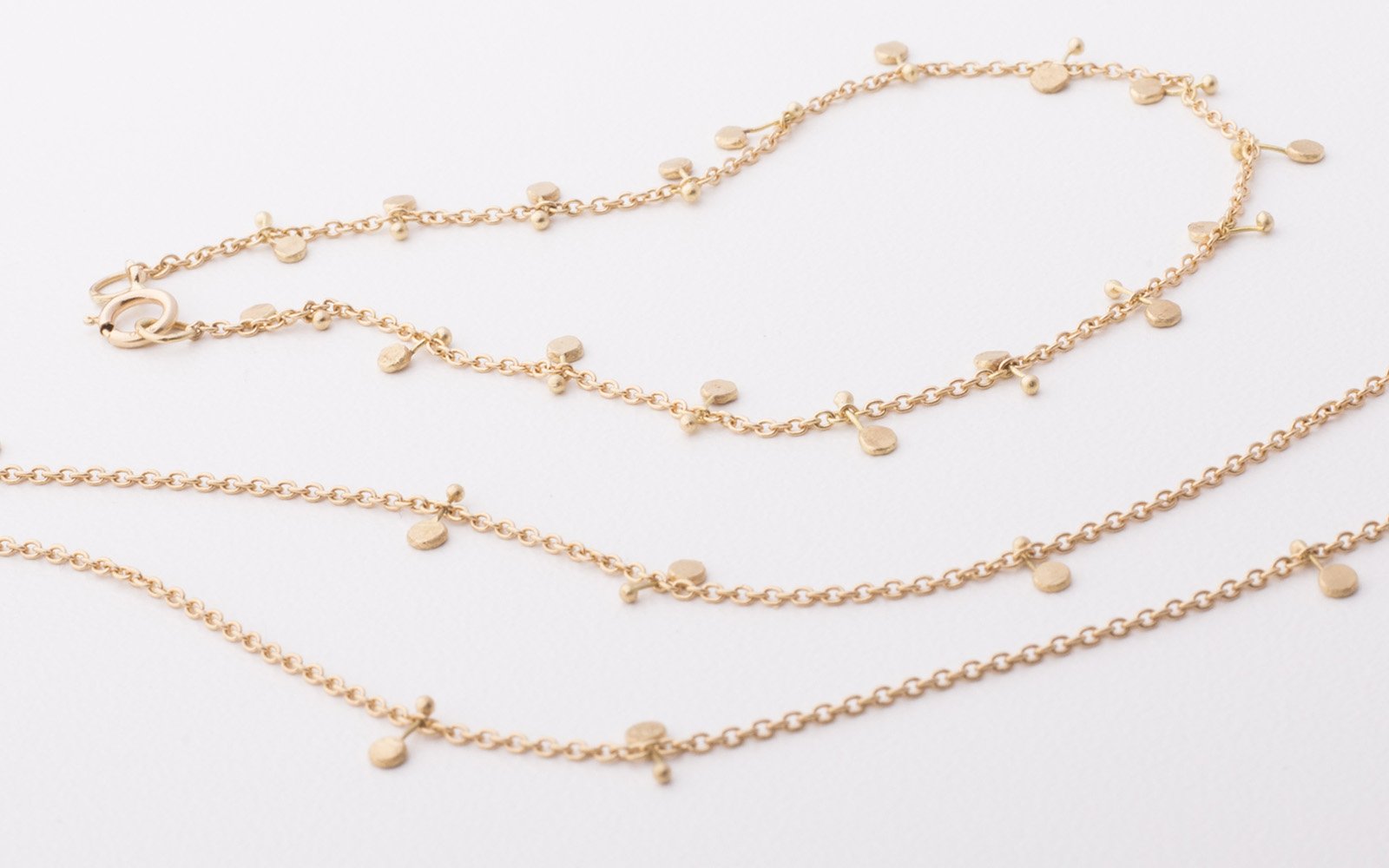 Fine 1 mm necklace in 18 ct gold and inserted 2 mm tiny platelets. The platelets are hammered flat, the traces from forging are left visible. The necklace has a round 5 mm spring clasp in 18 ct gold. Length of the chain: 45 cm / Number of platelets: 45, regular arrangement