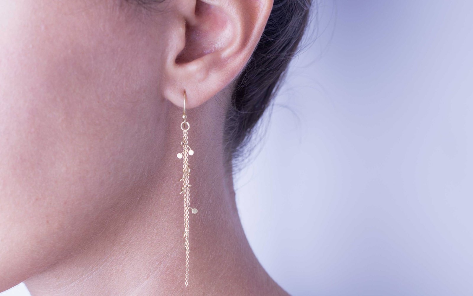 Earrings consisting of a thin 18 ct gold chain and small 2 mm plates inserted. The plates are hammered with the signs of forging left visible.