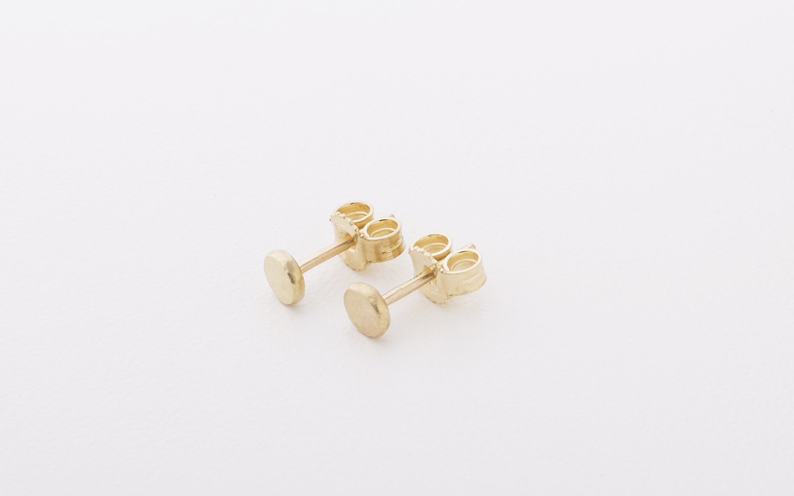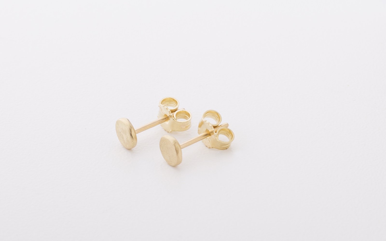 Round stud earrings in 18 ct gold. Forged and hammered flat platelets. Traces from forging are left visible. The stud earring has a length of 1 cm and a thickness of 1mm. The ear nut is in 18 kt gold.