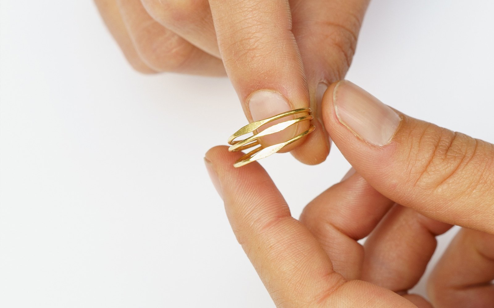 Fine ring in 18 ct gold. The ring is hammered flat at one point. The surface is satin-finished and slightly hammered.
